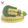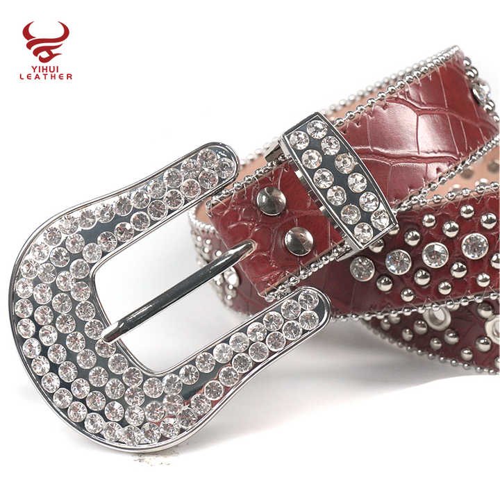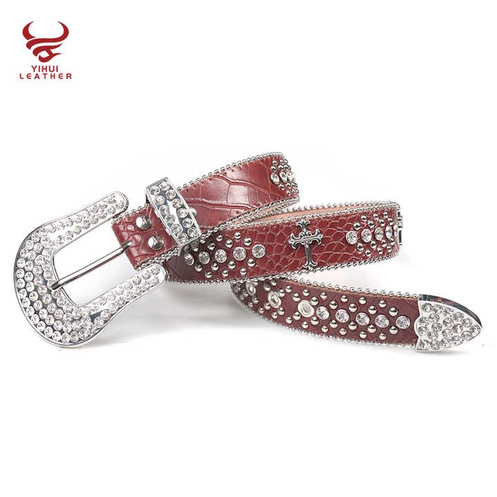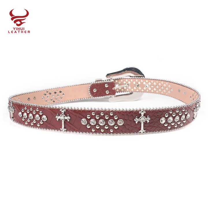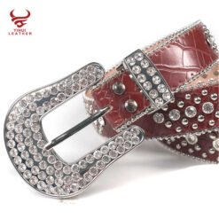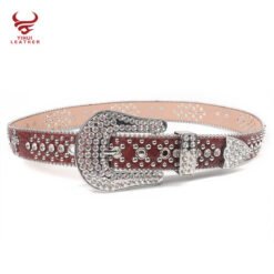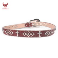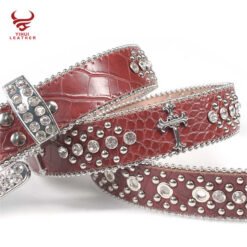 This striking red leather belt features a prominent cross design with sparkling diamond accents. The 4cm width makes a bold statement, while the vintage style appeals to western and urban fashion lovers alike. The rhinestone crystal beaded buckle adds luxurious detail to this already eye-catching accessory. Made with cowhide leather and zinc alloy components, it combines durability with style. Perfect for men who want to add some bling to their cowboy or rockstar-inspired looks.