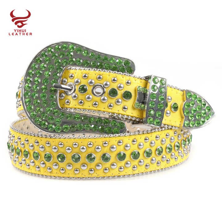 This original western belt showcases a vibrant yellow crocodile pattern PU leather with green shining rhinestones. The 3.8cm width and customizable length make it suitable for various body types. The zinc alloy pin buckle adds durability while complementing the luxurious design. Perfect for those who love bold colors and western aesthetics, this belt passes all EU standard tests. The YIHUI brand ensures quality craftsmanship in every detail. Whether for casual wear or special occasions, this belt makes a dazzling statement.