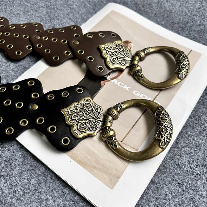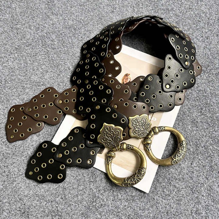 Embrace boho-chic style with this distinctive Western belt featuring hollow disc concho details. The 9cm wide PU leather strap is exceptionally soft and comfortable while the zinc alloy buckle ensures durability. Customizable length allows for perfect fit adjustment. This Y2K-inspired piece combines vintage cowboy aesthetics with contemporary fashion trends. The unique disk embellishments create eye-catching movement and texture making it a standout accessory for jeans skirts or dresses.