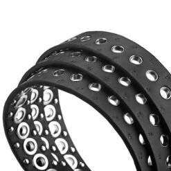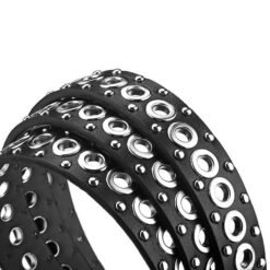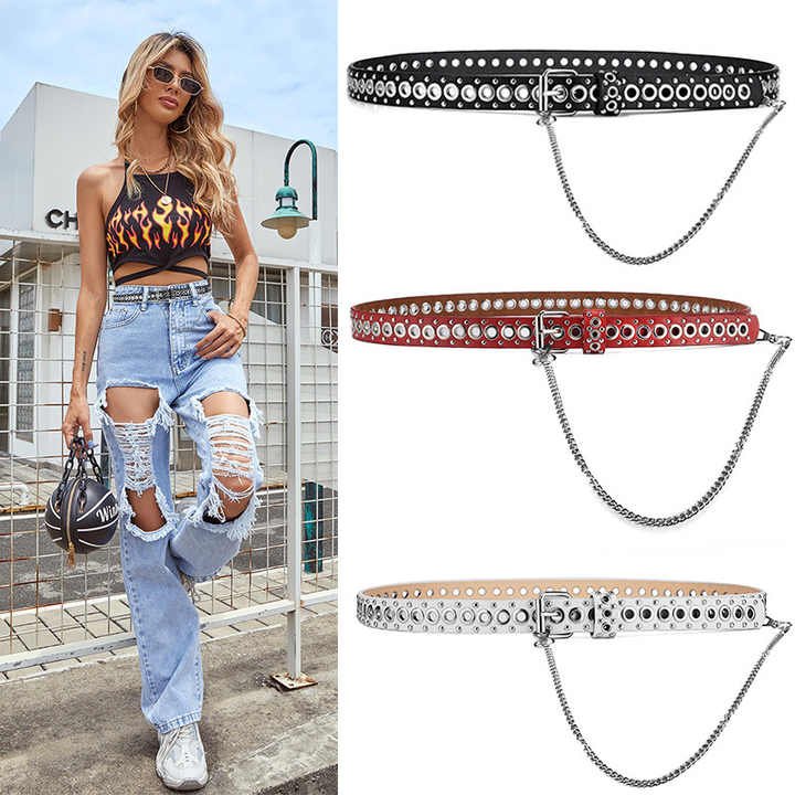 This bold 3cm belt combines studded details with dangling metal chains for maximum punk impact. Made from durable PU leather with an alloy buckle, it offers both style and functionality. The adjustable length ensures proper fit while the BSCI certification guarantees quality standards. Perfect for adding edge to jeans or dresses, this statement piece transitions effortlessly from streetwear to nightlife outfits.