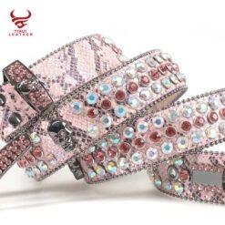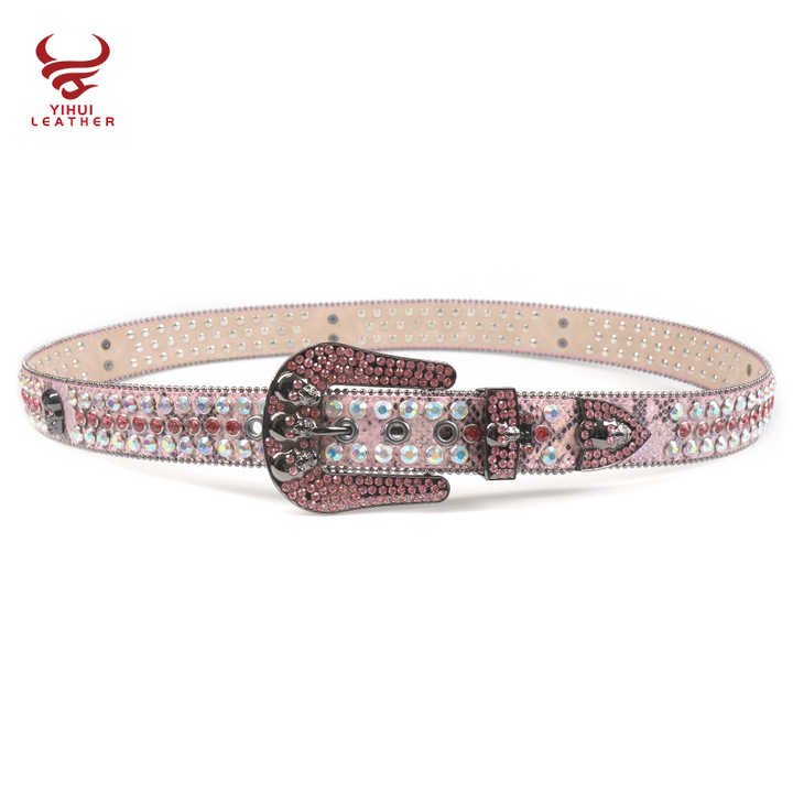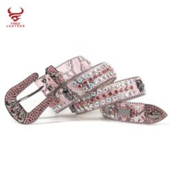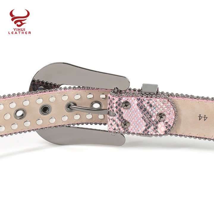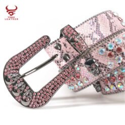 This eye-catching pink snakeskin belt combines edgy skull details with feminine charm. The colorful diamond studs on PU leather create a striking contrast against the pink background. With a 3.8cm width and customizable length, it flatters various body types. The zinc alloy skull buckle adds a bold statement to this already glamorous accessory. Perfect for summer fashion, it meets EU safety standards and passes all required tests. Whether paired with jeans or a dress, this belt adds a punk-meets-glam touch to any outfit.