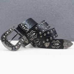 This edgy Y2K belt combines crocodile pattern leather with studded spider details and a three-piece buckle set. The 4cm width and multiple length options (105-125cm) ensure versatility. The goth aesthetic meets western influences for a unique fashion statement. Perfect for cowgirls and cowboys who appreciate alternative style. The spider motifs add a rebellious touch while the quality construction ensures durability.